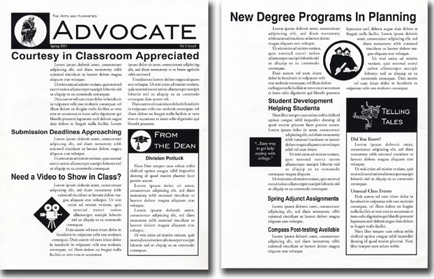 The Advocate Newsletter - -A competitive piece for the Arts and Humanities department at Oklahoma City Community College. The goal was to visually stimulating design that could be easily reproduced on a plain black and white copier.