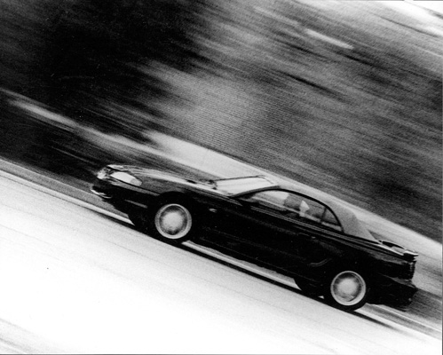 - - Shot with a 35mm SLR camera on 400 speed T-Max Black and white. It features a panning effect that keeps the car in focus and the background in motion blur, helping to emphasize speed.